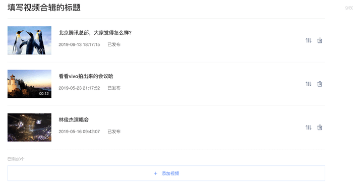 l 设置合辑的标题,并点击视频合辑入口,选择已发布且有推荐的视频添加至合辑中,每个合辑可添加5-20条视频。