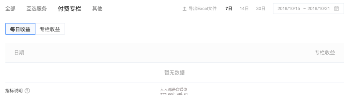 选择【收益广场】-【额外收益】-付费专栏中可以查看自己的专栏收益数据,包含付费专栏过去 n 天的收益,付费专栏的每日收益、趋势图,仅展示完结专栏应分润给作者的收益。