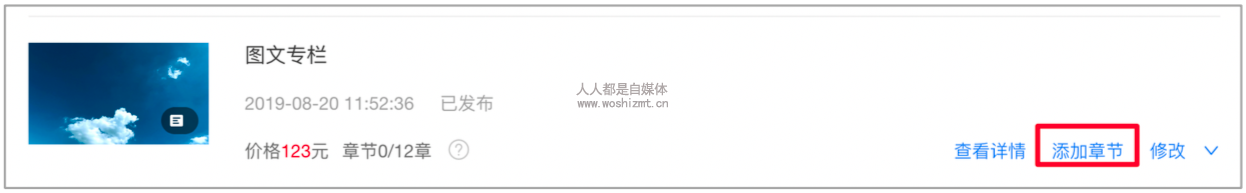 更新已发布的专栏,直接选择【发布】-【付费专栏】-【图文专栏】或选择【内容管理】-【付费专栏】,在其中选择想要更新的专栏,点击【添加章节】,即可在其中上传图文章节。