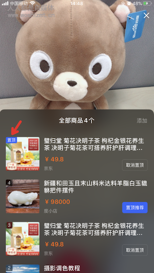 直播时新增推荐商品功能,点击【置顶推荐】按钮并确定,则商品置顶在已添加弹层顶部,商品显示在首位展示【置顶】标识,其他商品顺移。