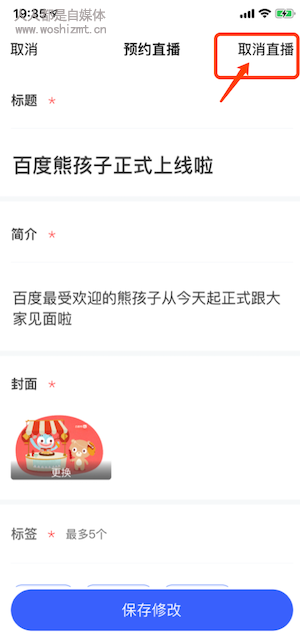 点击右上角编辑按钮,可重新修改直播间相关信息并重新保存,也可取消直播。
