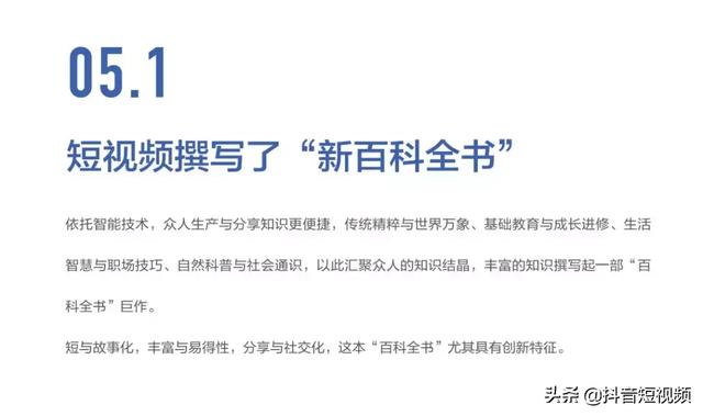 《报告》指出,抖音短视频由于兼具“短与故事化(short and story-like)”、“丰富与易得性(sufficient and searchable)”、“分享与社交化(sharing and socializing)”6S特征,便利了知识的生产与分享,从而得以汇聚大众知识结晶、撰写当代新“百科全书”。而这部集合了传统精粹与世界万象、基础教育与成长进修、生活智慧与职场技巧、自然科普与社会通识的“百科全书”,正在成为当代青少年教育的新工具。