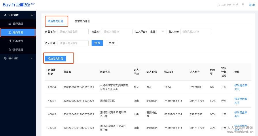 单品定向计划:商家后台——营销中心——精选联盟——定向计划——选择单品定向计划——添加推广商品——选择商品,输入达人平台、达人uid和佣金率。