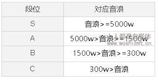 根据每周周一到周日24:00的公会实时音浪数据,公会进入对应的段位进行竞争排名,各段位对应音浪如表所示