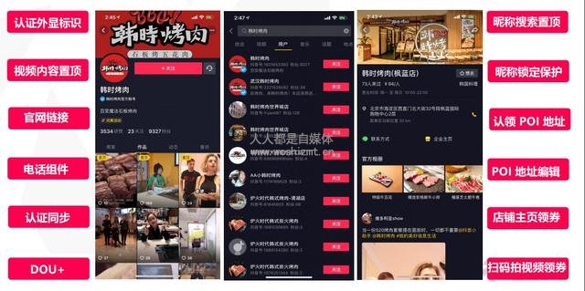 1.认证外显标识;2.视频内容置顶;3.官网链接;4.电话组件;5.认证同步;6.DOU+;7.昵称搜索置顶;8.昵称锁定保护;9.认领POI地址;10.POI地址编辑;11.店铺主页领券;12.扫码拍视频领券;13.产品转化页;14.商家页面;15.私信管理;16.数据分析;17.评论管理;18.用户管理;19.子母账号;20.粉丝画像