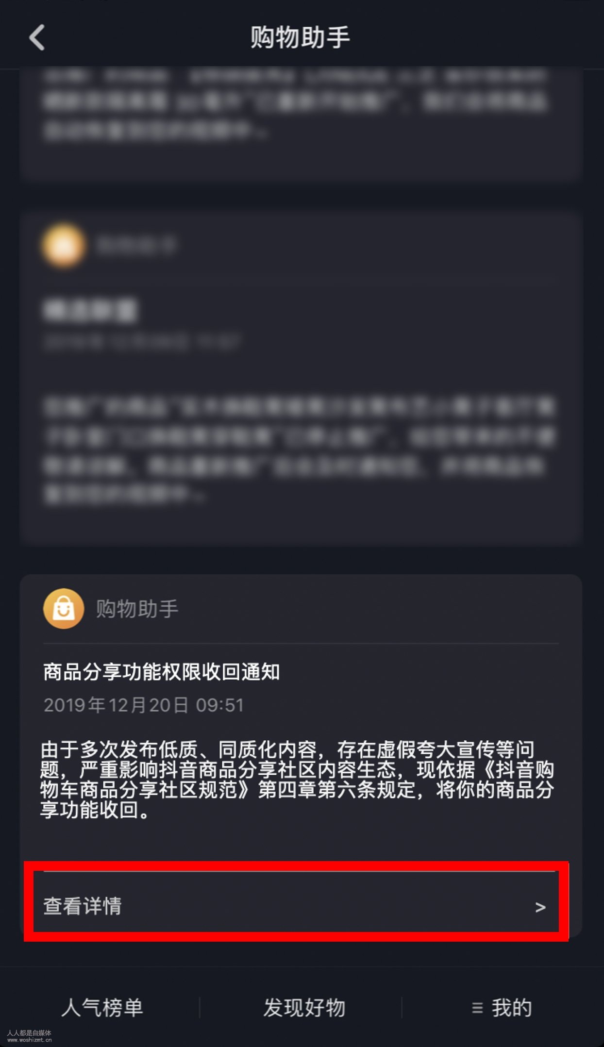 抖音首页:点击【消息】 - 找到并点击【购物助手】 - 找到【商品分享功能权限收回通知】 - 点击通知下方【查看详情】 - 点击【立即申诉】