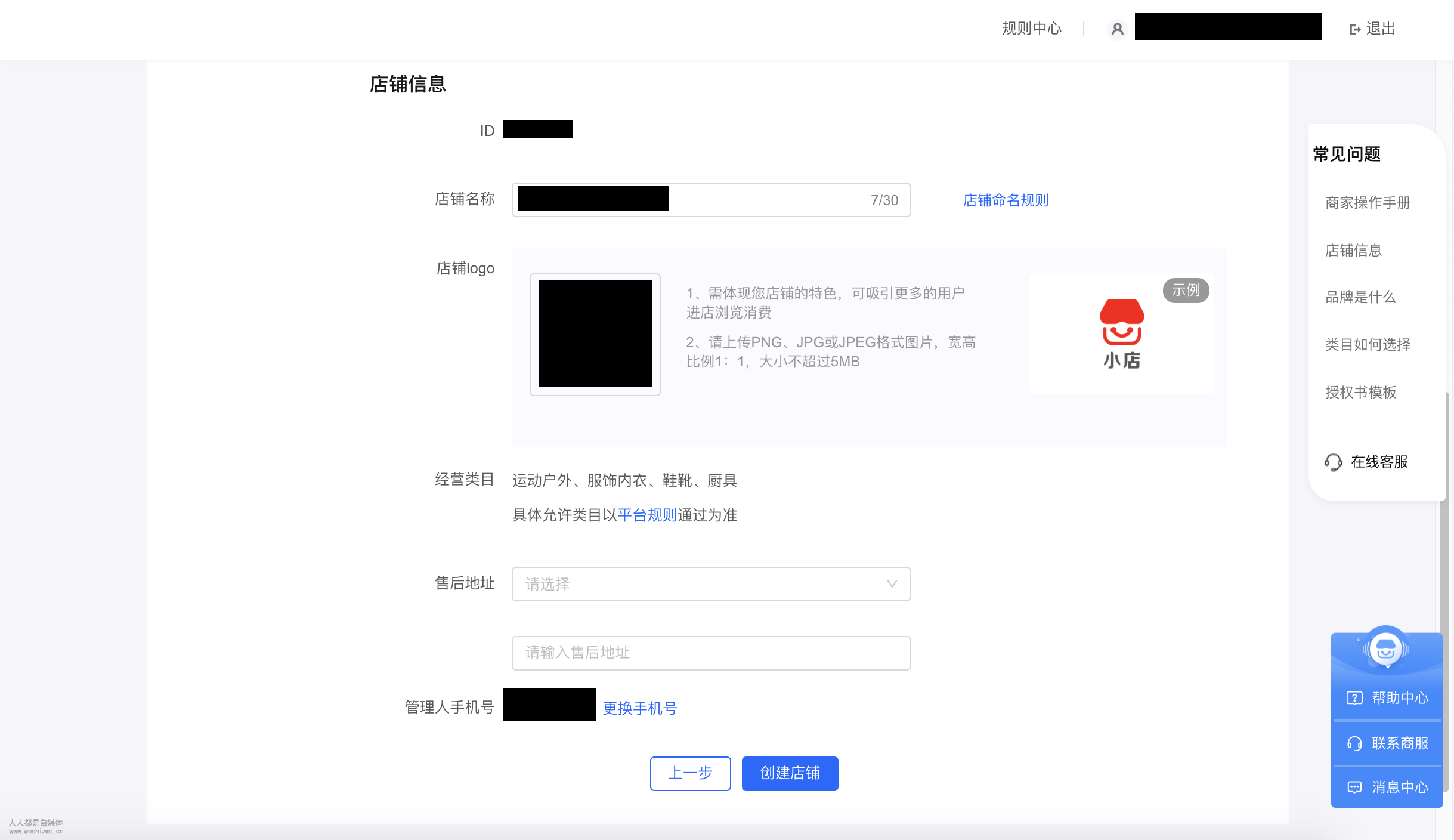 店铺信息填写:店铺名称,店铺logo,经营仅限一级类目为运功户外、服饰内衣、鞋靴和厨具下的部分子类目,售后地址和管理人手机号。