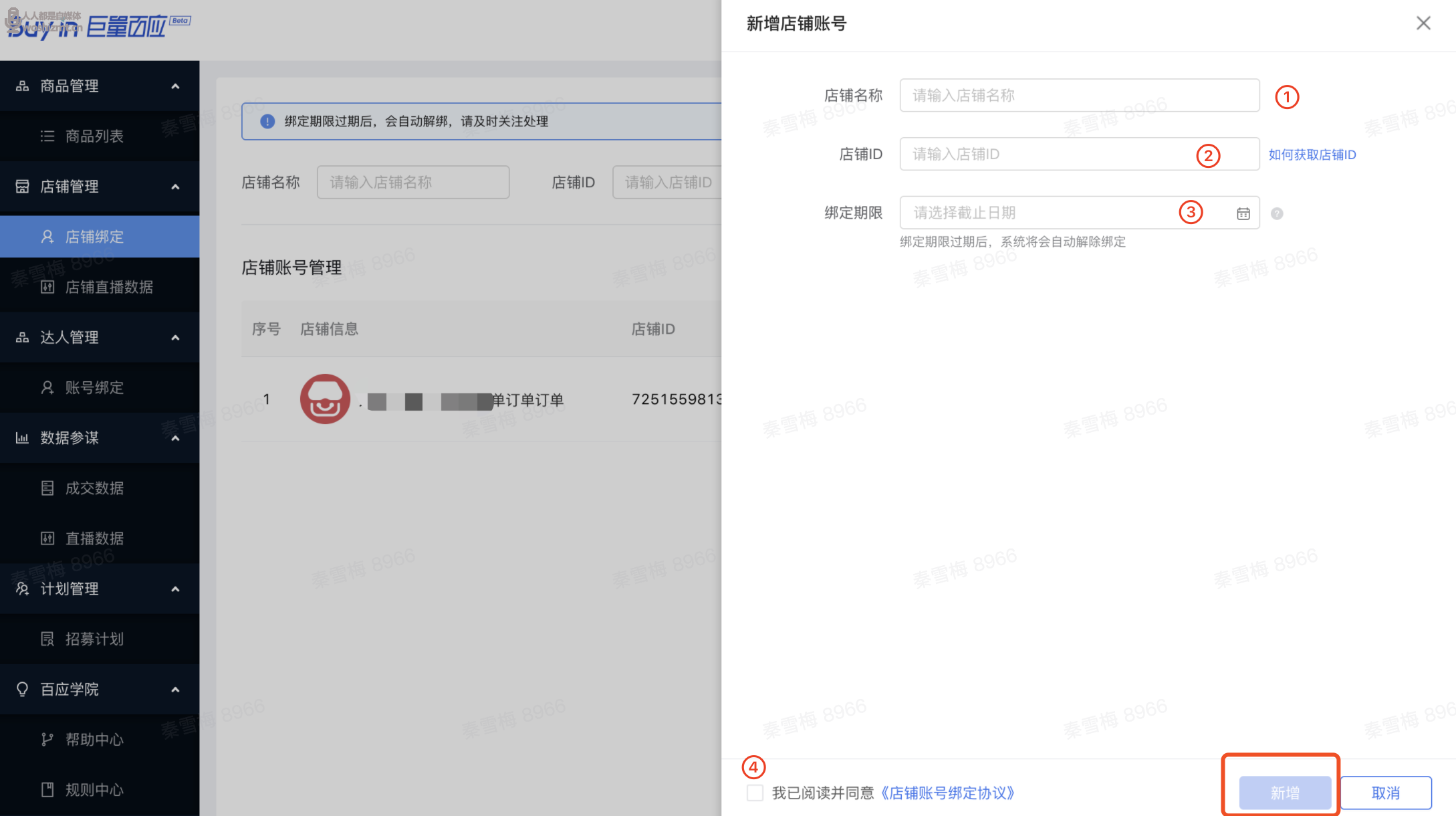 2、填写「店铺名称」、「店铺ID」、「绑定期限」,勾选“我已阅读并同意”,点击【新增】