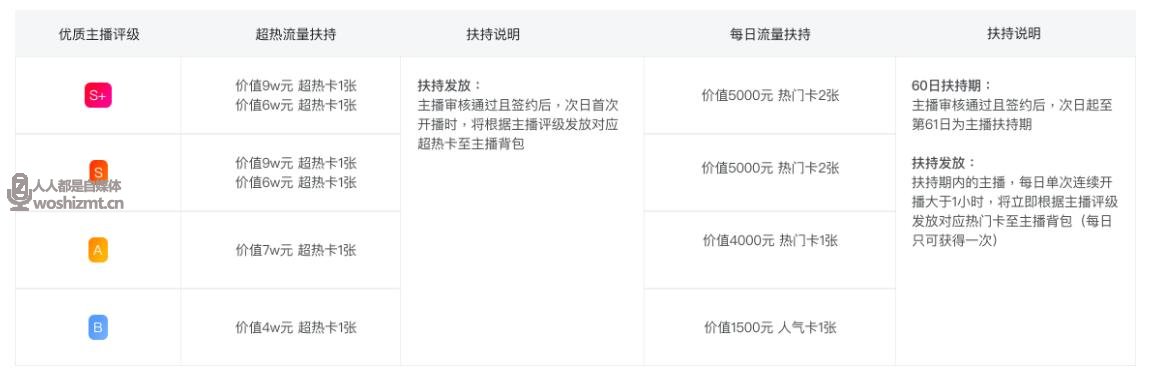 参与优质主播扶持计划的主播应为行业内业务水平出色、直播技能熟练的优质主播,具备良好的才艺、人气、商业价值,主播个人无劣迹及负面新闻,并能够提供相关证明材料,平台将根据主播综合素质水平及参考主播过往直播流水(S+需为近24月内表现,S、A、B需为近3月内表现)进行评级,签约后可匹配相应的扶持资源。(直播流水为参考,非唯一决定因素)