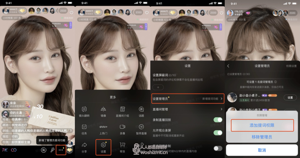 如果不是主播经纪人,主播可在C端设置为管理员,直播时点击「更多-设置-设置管理员-设置-添加提词权限」