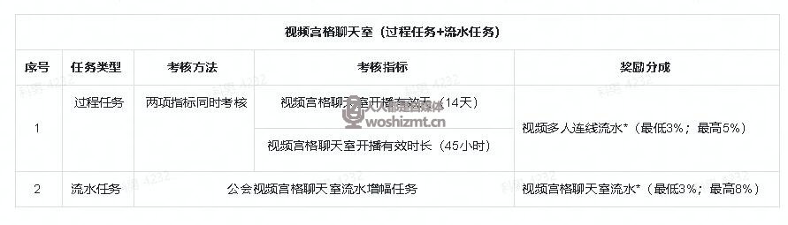 完成过程任务指标考核的单个视频宫格聊天室,根据获得流水的主播(嘉宾)身份,则公会可以获得视频多人连线流水*对应奖励分成比的过程任务奖励。
