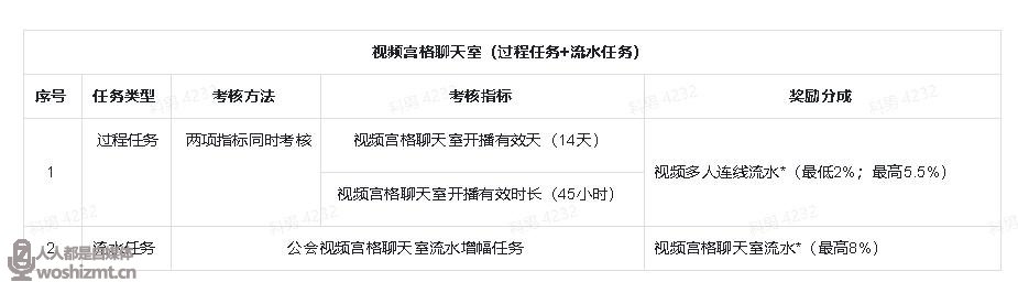 - 完成过程任务指标考核的单个视频宫格聊天室,根据获得流水的主播(嘉宾)身份,则公会可以获得视频多人连线流水*对应奖励分成比的过程任务奖励。