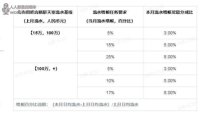 · 根据上月公会的视频宫格聊天室流水基线和对应的流水增幅任务要求,公会可获得下表中所对应的流水任务奖励。流水任务奖励=公会视频宫格聊天室流水*对应奖励分成比。