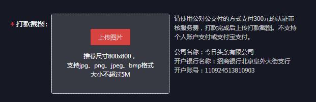 请使用银行对公账号对公转账方式支付的方式支付300元的认证审核服务费,打款完成后上传打款截图。不支持个人账户支付、支付宝、微信等第三方支付。