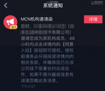有粉丝咨询站长,抖音上收到了系统通知:MCN机构邀请邀请函,某某有限公司邀请您成为其机构成员,48小时内点击详情内的【同意入驻】按钮即可授权。授权前请务必仔细阅读详