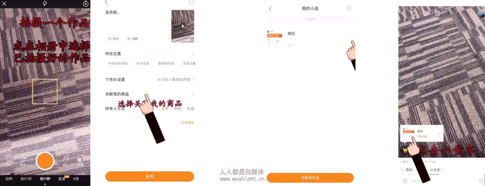 拍摄视频——在点击「发布」前——点击「关联我的商品」——选择对应商品——完成视频发布
