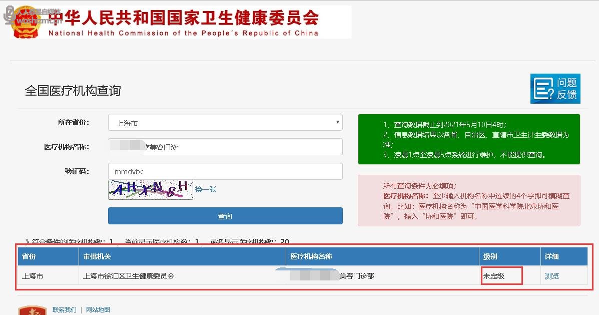 2、输入机构名称,至少输入机构名称中连续的4个字即可模糊查询。比如:医疗机构名称为“中国医学科学院北京协和医院”,输入“协和医院”即可。