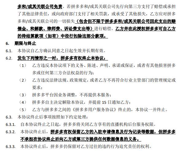 请您在进一步操作之前仔细阅读、充分理解本协议的各个条款,特别是以加粗形式提示您注意的限制或排除权利、加重责任等内容。您有权选择同意或不同意本协议,您按照入驻申请页面提示在线确认同意本协议,即视为您已充分阅读、理解本协议,并自愿受本协议的约束。阅读本协议过程中,如果您不同意本协议或其中任何条款,请立即停止入驻申请并停止使用拼多多直播机构后台服务。本“提示条款”是本协议正文的组成部分。