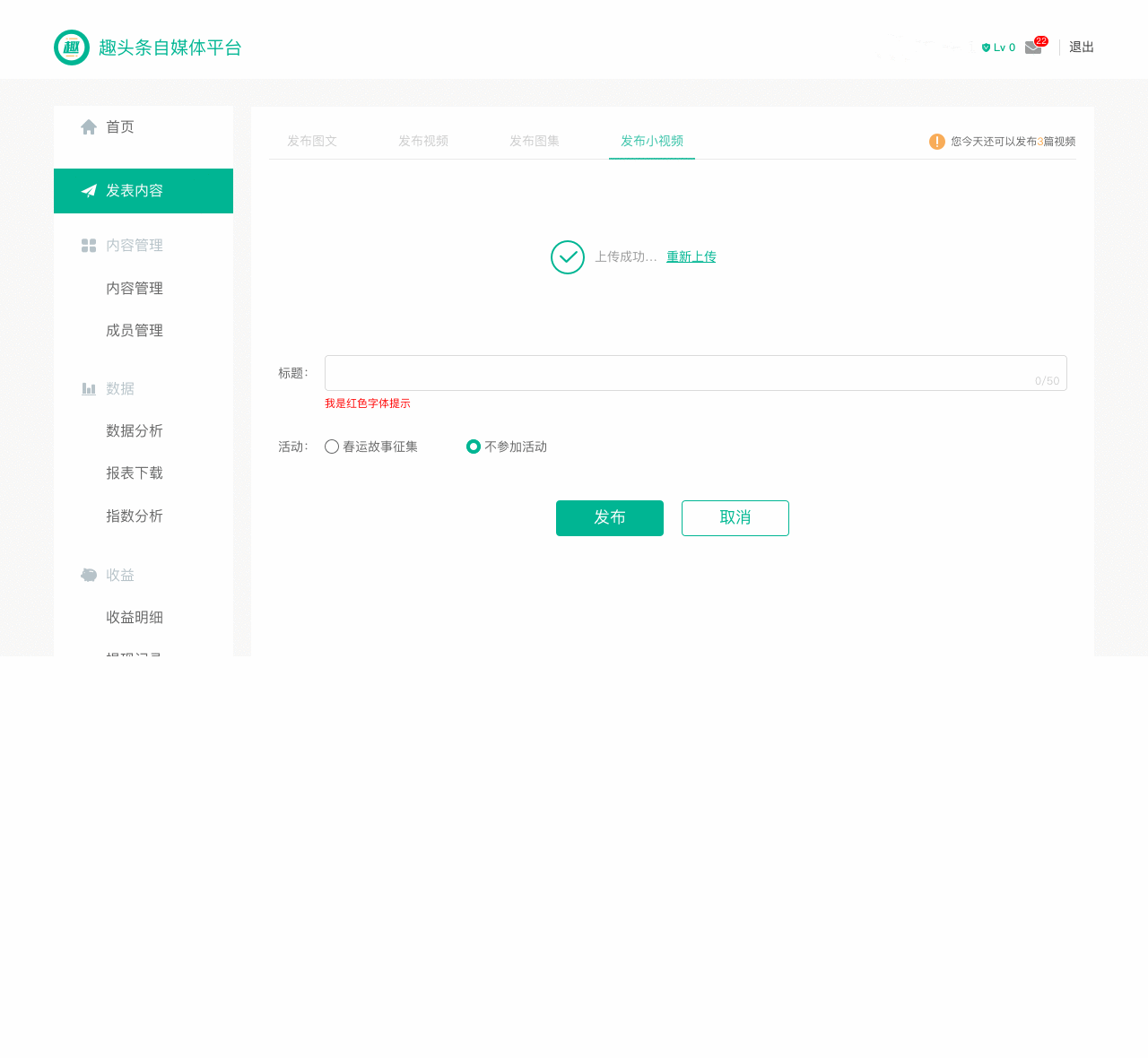 1. 登录趣头条自媒体平台,在首页点击【发表内容】—【发表小视频】进入小视频发布页。