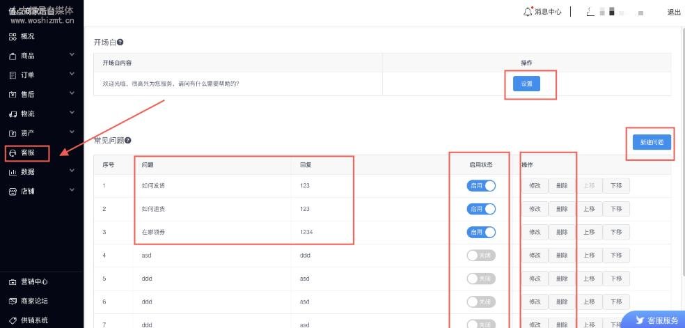 1) 选择【客服】选项,可以设置用户点击在线咨询后展示的客服开场白、常见问题等。