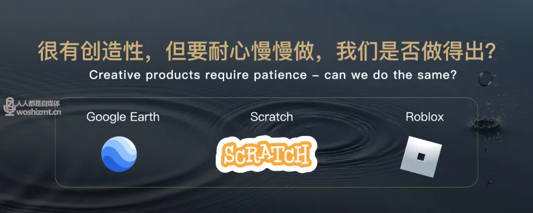 我这里贴了三个产品,它们都做得很好,一个是Google Earth,我经常用它来学地理,这个产品很伟大但不赚钱。Scratch,儿童编程,赚不赚钱我不知道,但也很伟大。Roblox,一种UGC的沙盒游戏,跟我们平时说的游戏非常不一样。