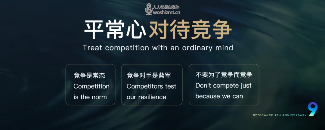 3月30日,在公司9周年庆上,字节跳动创始人张一鸣发表了演讲《平常心做非常事》,分享了他对于“平常心”的思考:如何以平常心对待自身、公司业务、行业竞争、成功和失败。