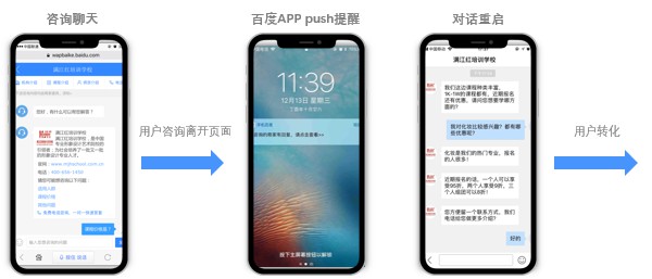 『咨询唤醒』:如果咨询量很大的百度客户,经常有这样的场景:用户跟客服在资讯聊天的时候,用户经常会中断聊天。在以前,中断之后客服就找不到用户,导致大量的潜在消费者流失。
