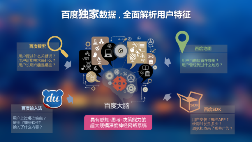 百度移动 DSP(Demand Side Platform):是百度专业的移动展示广告投放平台。移动DSP推广涵盖海量的移动媒体,拥有大数据分析功能,通过精准定向的技术手段,以及终端、媒体、地域、关键词、人群兴趣属性等多维度技术锁定,挖掘移动投放广告主的全方位需求,直达目标人群。为广告主打造“专业、可依赖”的移动营销平台,达到广告主在移动端精准营销、高效营销的目的。