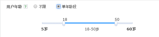 可以根据所推广商品针对的用户群体所在的年龄段范围,从5岁-60岁之间以1岁为维度任意选择投放的年龄段。