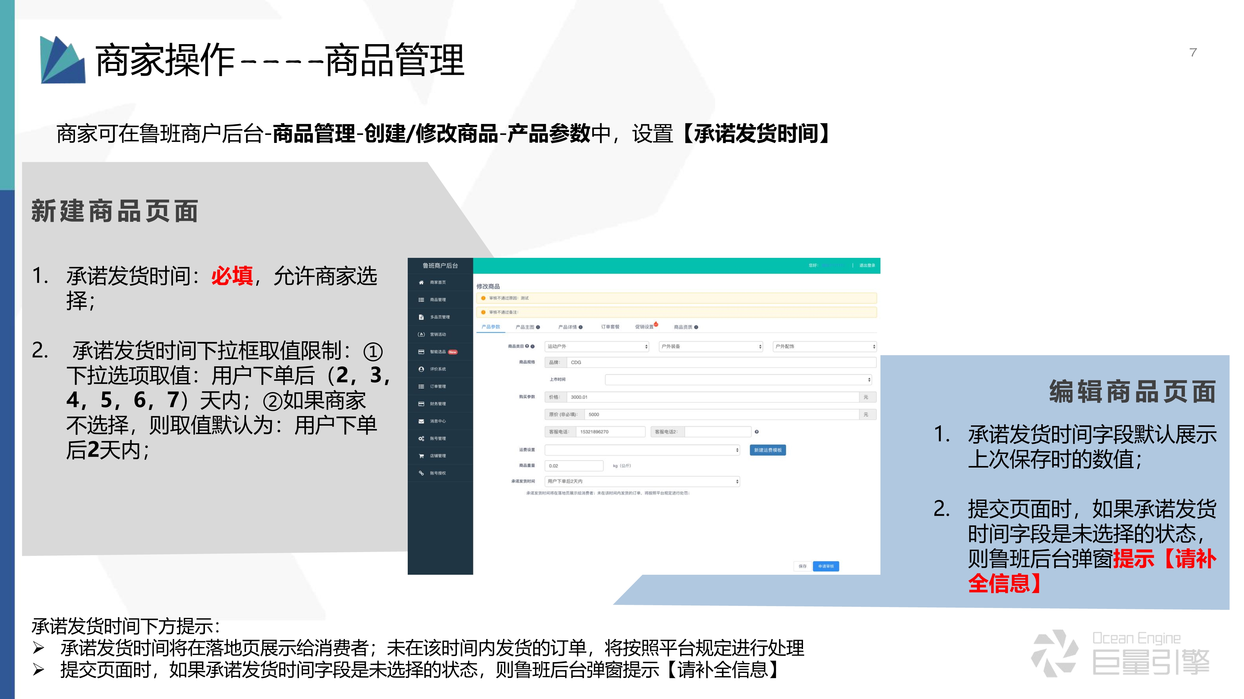 1、新建商品页面设置承诺发货选项,为必填项,承诺发货时间下拉框取值限制:①下拉选项取值:用户下单后(2,3,4,5,6,7)天内;②如果商家不选择,则取值默认为:用户下单后2天内;