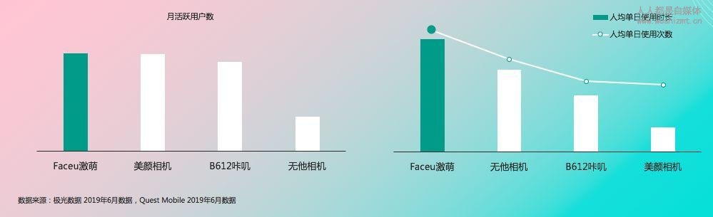 极光大数据显示,截至2019年6月,Faceu激萌的月活用户已突破9000万。而据QuestMobile数据,在拍照摄影品类的排行榜中,Faceu激萌在日活、月活用户数、月均使用次数等榜单中均排名榜首,成为该品类中最具流量价值的APP。