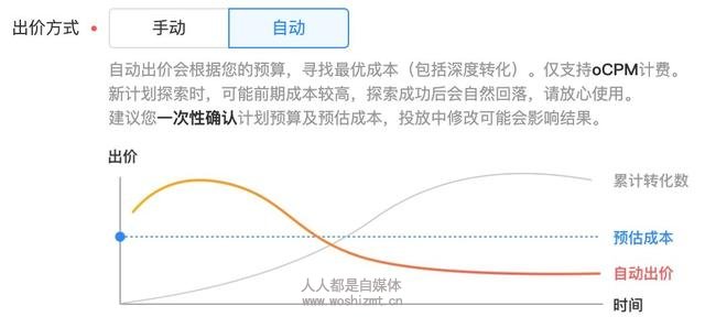 1)自动出价的新计划,初期日预算不要设置过高,因为系统会根据预算,来判断你的跑量需求,会影响出价幅度。后台设置时也可以观察到,预算越高,系统预估成本越高。所以建议采取「小步快跑」的预算策略,即初期给小一些预算,当预算花完成本ok情况下,继续加预算,跑完再加。