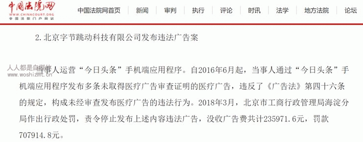 2018年3月,今日头条APP因发布多条未取得医疗广告审查证明的医疗广告,被没收广告费23万余元,并罚款70.79万元。