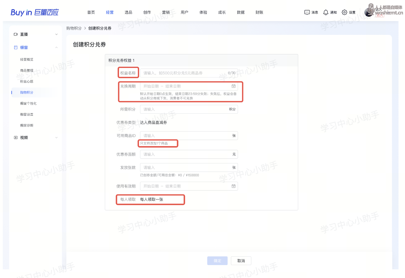 达人使用营销账户的资金,创建积分兑商品券的权益,包括优惠券面额、可用商品、使用有效期等信息